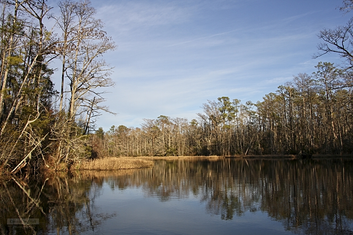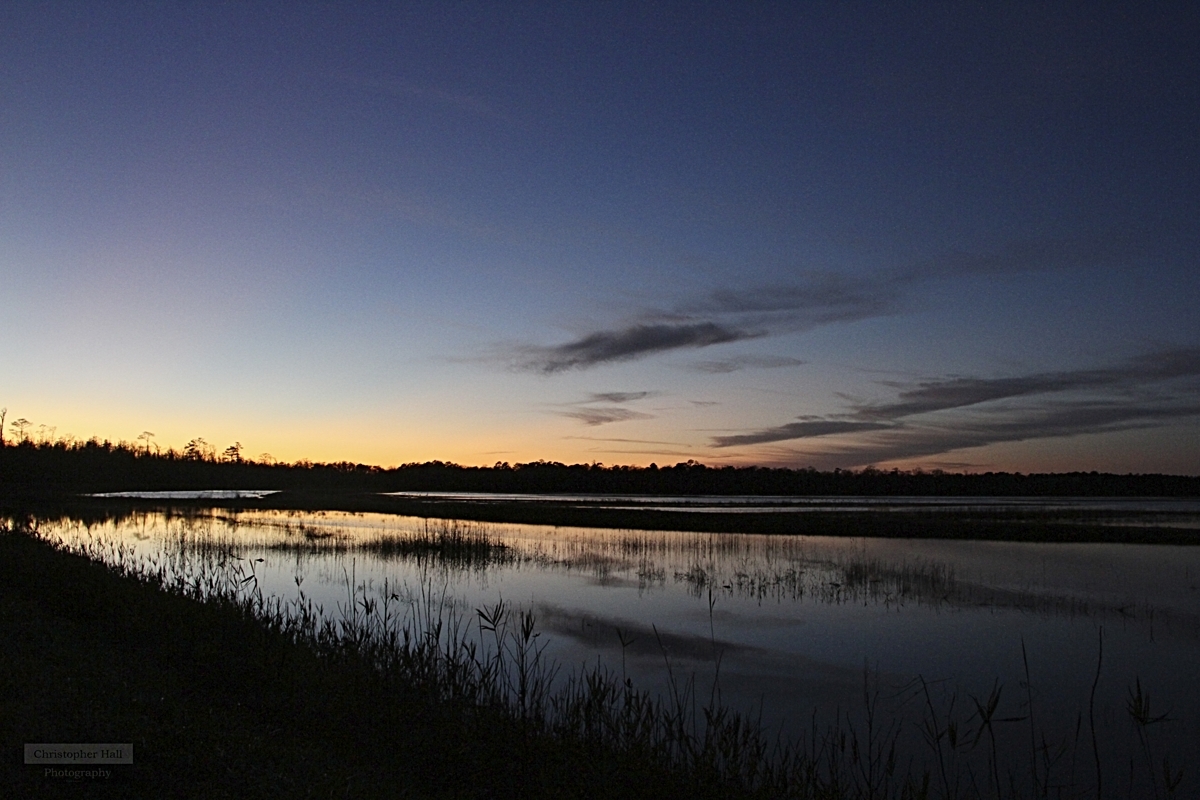 The last light of the day was quickly slipping away and I looked at my maps to chart a course out of the refuge and put me on the path back to Nags Head. I turned the car around and started heading out. One dirt road looks like the next and I had found myself at a stop sign. Right or left? I looked at the map again and looked inside myself. I was disappointed that I hadn’t seen the critters I came searching for. A car came up behind me and I motioned them around. They turned right, so I turned left, holding out in hope for one last chance. Dusk had fallen upon the wetlands and as I slowly drove forward, I followed the bend in the road. As I turned the corner, I was amazed to see the last light of a sun spilling over the horizon’s edge, casting yellow, orange, and pink just over the treetops. The sky, a light blue, faded into a darker hue and the last light slipping away, leaving clouds a dark shade of gray. The stillness of nightfall had come, but the days last sound was of Tundra Swans bidding all a goodnight.